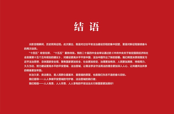 荣誉墙,是我们本次图片展的尾声。虽然获得的荣誉名称不同,但他们都有一个共同的特点,那就是模范遵守法律。其中最有分量的,就是平安中国建设示范市和第三批全国法治政府建设示范市。这也是本次图片展两大主题的最高荣誉。荣誉的背后,既有政法机关的履职尽责、也有各级各部门的担当作为,更有人民群众的支持配合。就像我们在前言中所说的,平安法治建设,没有旁观者、局外人,每一个人都是主角。