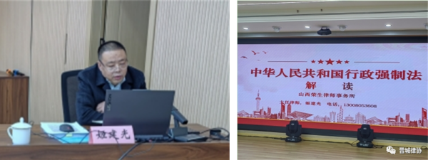 山西荣生律师事务所主任姬建光律师在高平市委党校分校为高平市直各单位、各乡镇(街道)的一线执法人员和法制审核人员详细解读《中华人民共和国行政强制法》。