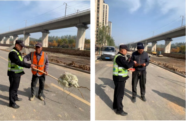 检查发现,部分工地遗留塑料薄膜、编织袋、彩钢瓦等轻(硬)飘物,这些物品在大风天气下极易被风刮起,挂碰高铁接触网,危及行车安全,甚至引发列车停运。对此,联合检查组现场责令施工单位限期整改,督促其立即清理现场杂物,并建立轻(硬)飘物常态化清理机制,从源头防范异物挂网安全风险。同时,检查组还结合冬季高铁安全实际,向施工单位管理人员和一线作业人员开展专题宣传,重点讲解轻(硬)飘物挂网、沿线焚火烧荒等危害,进一步增强施工人员的爱路护路意识,引导其主动排查、及时整治隐患,共同维护高铁运输安全稳定。