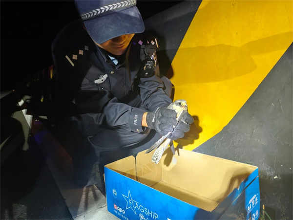 当晚,民警驾车巡逻至辖区西冶村路段时,路边一团蜷缩的黑影引起了他们的注意。停车靠近后发现,这是一只外形独特的鸟类,羽翼受伤无法正常飞行,在夜色中显得格外脆弱。凭借对野生动物保护知识的掌握,民警立刻判断出,这正是国家二级保护野生动物——游隼。