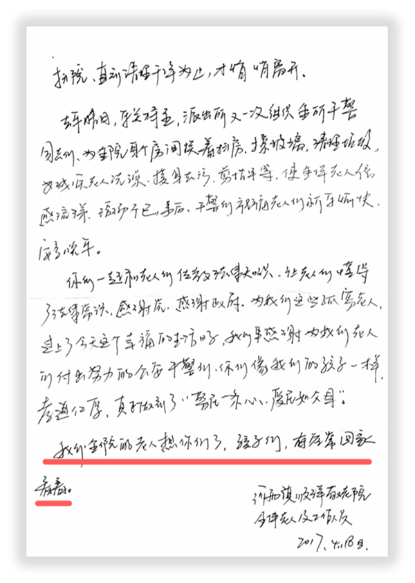 在学雷锋纪念日到来之际,我们从一封珍藏多年的信件说起。2017 年春天,高平市河西镇顺洋敬老院的老人与工作人员,为河西派出所“热血心安 ‘枫警’一线”志愿服务队写下满含深情的话语。信末那句 “我们全院的老人想你们了,有空常回家看看”,温暖了每一位民警的心,“回家” 二字,也成为这支志愿队伍心中最柔软的牵挂。