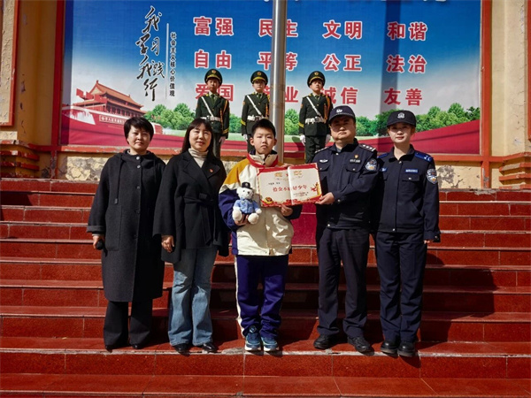 “这是属于你的荣誉!”3月5日,在师生的见证下,民警为实验小学学生张家豪颁发了“拾金不昧”荣誉证书,并送上一只可爱的“警察小熊”作为奖励。原来,在元宵节期间,张家豪在回家途中拾获1000余元现金,面对“诱惑”毫不动摇,主动将现金上交派出所。为表彰张家豪拾金不昧的行为,龙港派出所民警特意在“学雷锋纪念日”这一天,到学校表彰该学生,并当场宣读表扬通报。“希望同学们以张家豪为榜样,从小事做起,传递温暖,争做新时代雷锋式好少年。”民警的寄语引发阵阵掌声。“这样的‘开学第一课’既有温度又有意义!”现场学生表示道。与此同时,民警辅警还开展了校园安全知识宣讲。